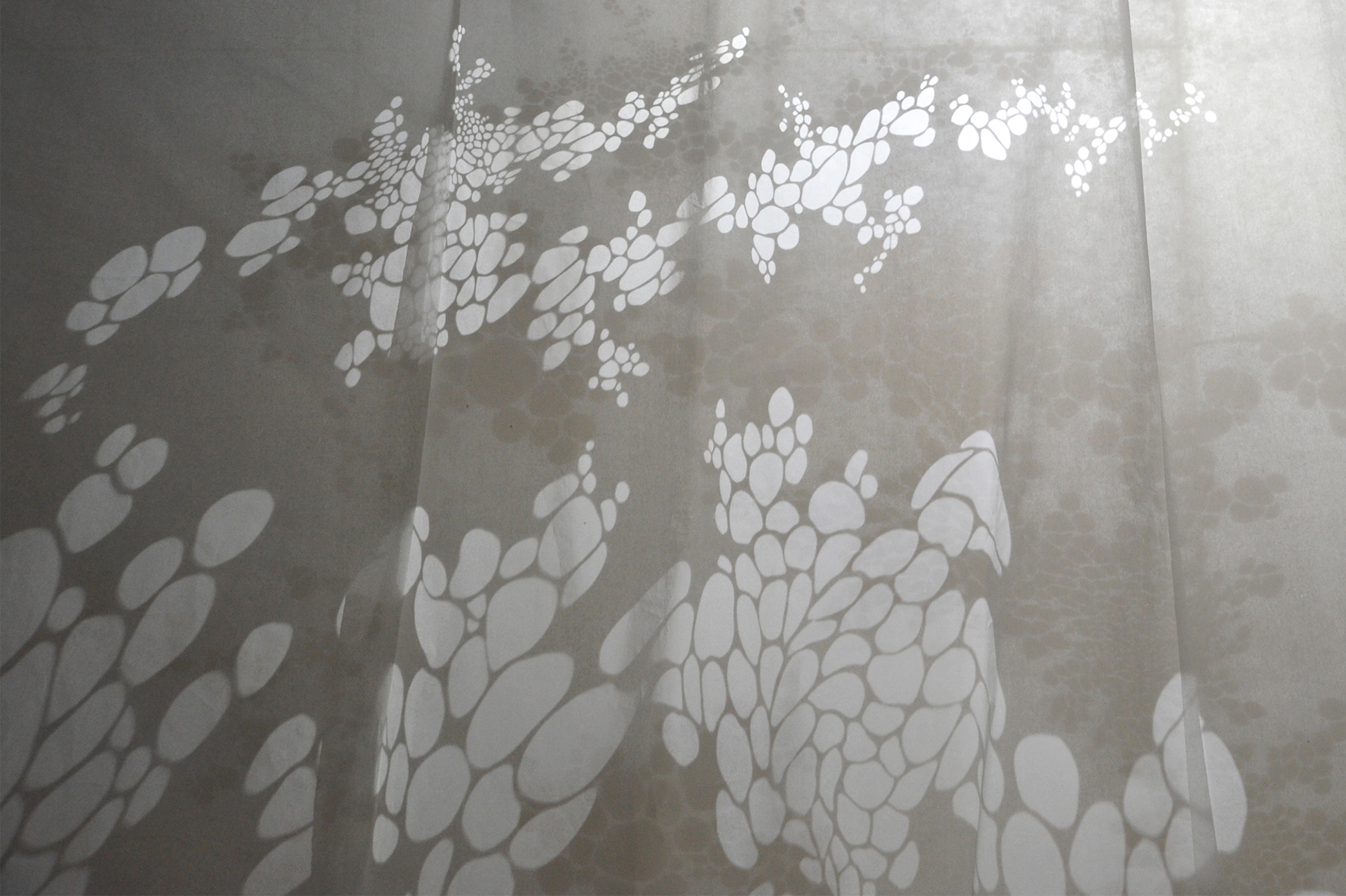 Papermaking by hand involves long and complex processes. Every single element is important as well as the quality of the material and the water. I was inspired by the beauty of this time-consuming handcraft and fragments that caught my eye during my paper-making experience; the surface of cold water, the reflection of light, the floating fibre and the seasonal change. It was delicate and organic.